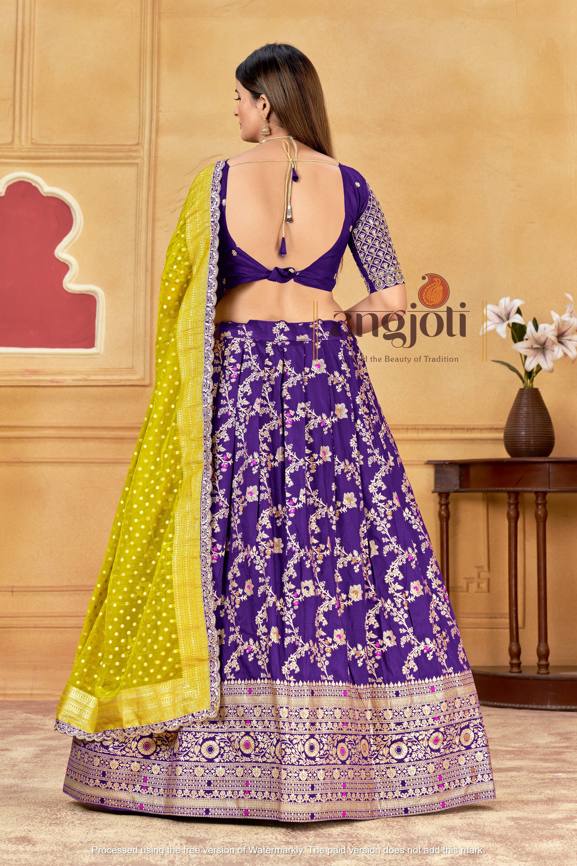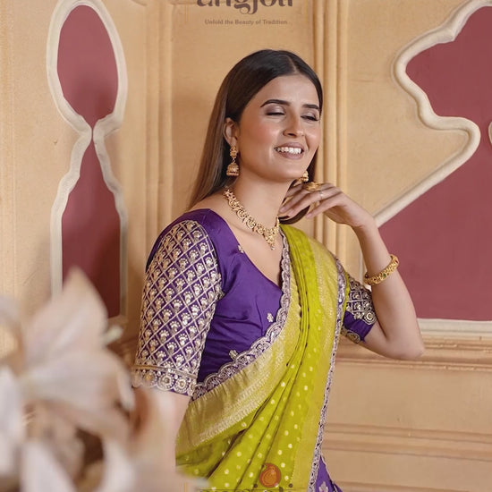 Step into elegance with this exquisite Blue yellow silk lehenga saree, crafted to bring out your festive glow. The outfit features a rich purple embroidered blouse paired with a lime-yellow bandhej-style dupatta, finished with a delicate zari border.