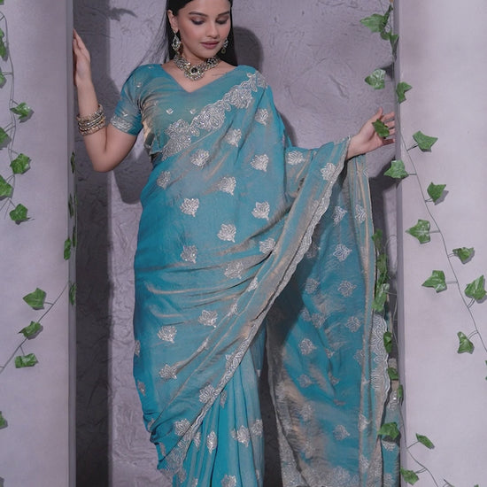 A stunning teal blue designer saree featuring intricate embroidered motifs, shimmering zari work, and a beautifully crafted heavy lace border. Perfect for weddings, parties, festivals, and premium traditional occasions.