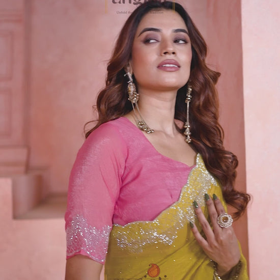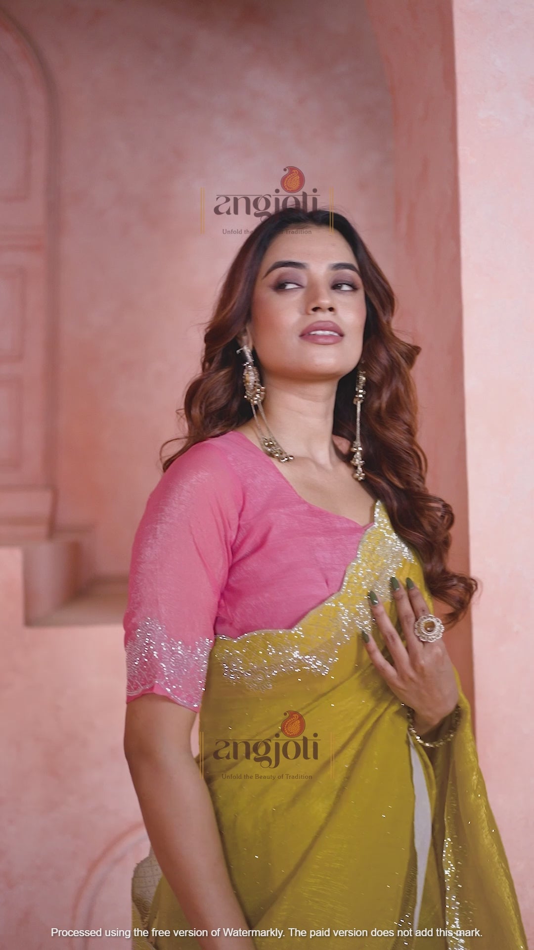 Color: Bright Lime Yellow Saree with Soft Pink Blouse