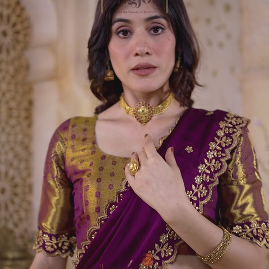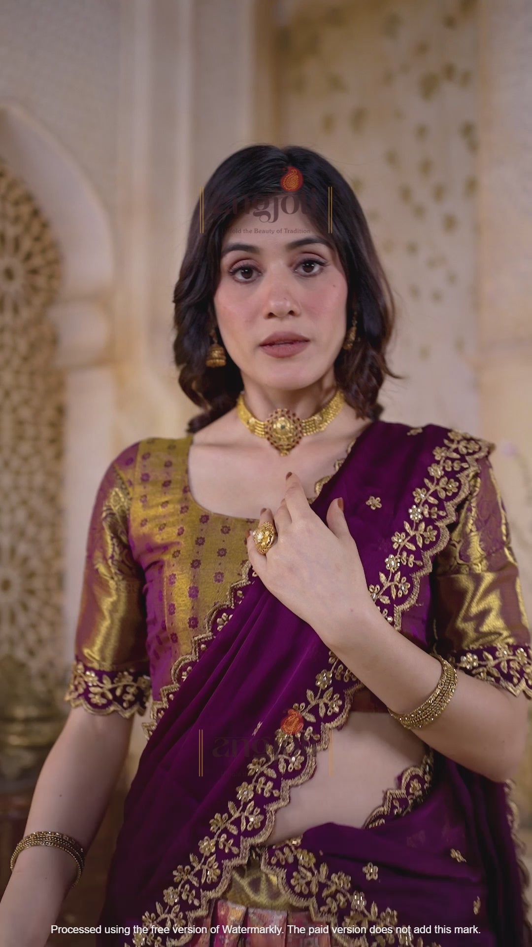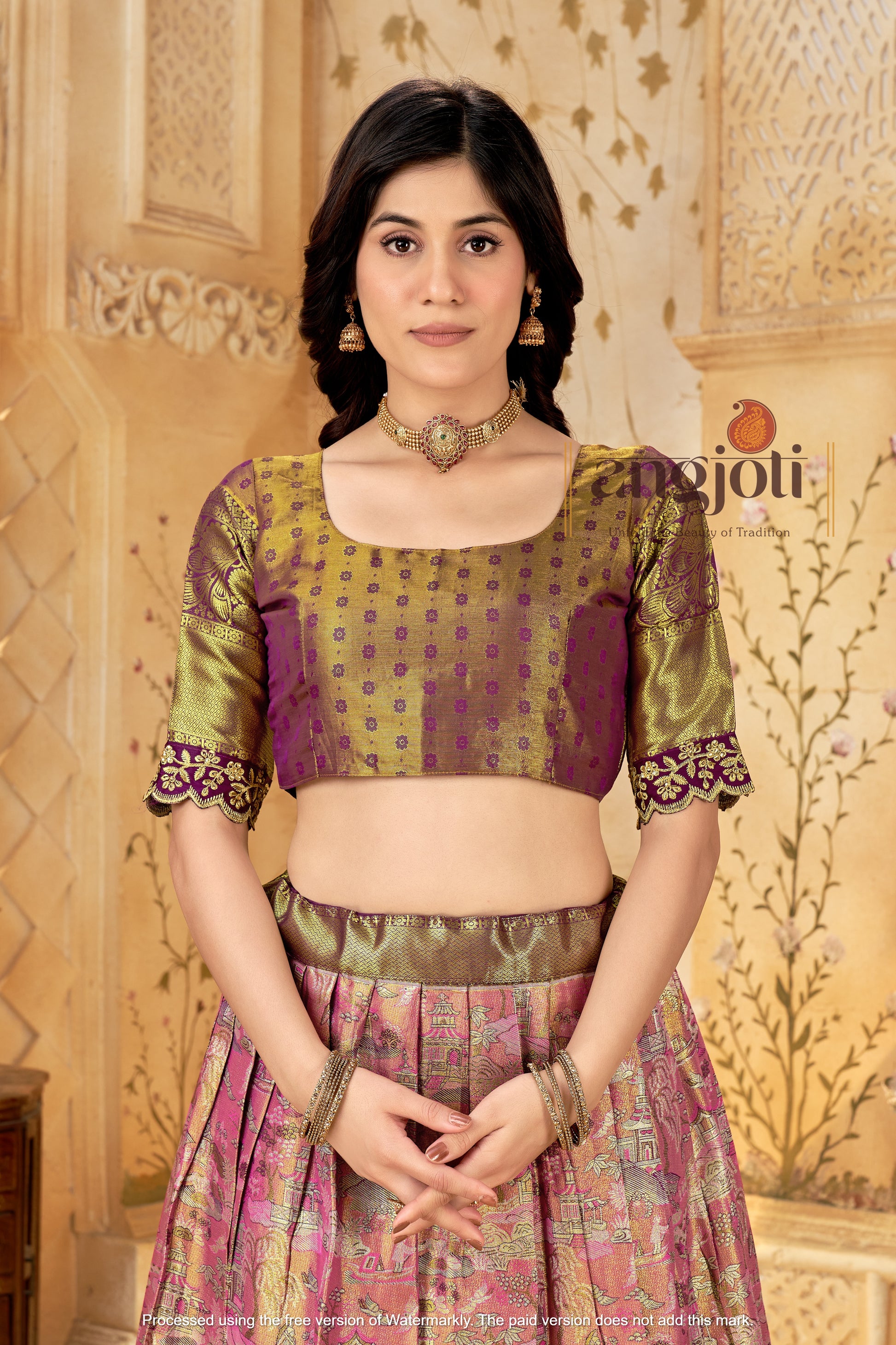 A luxurious brocade silk lehenga in shades of Wine and gold paired with a rich Gold wine blouse and embroidered dupatta. Perfect for weddings, festive ceremonies, and traditional South Indian occasions.