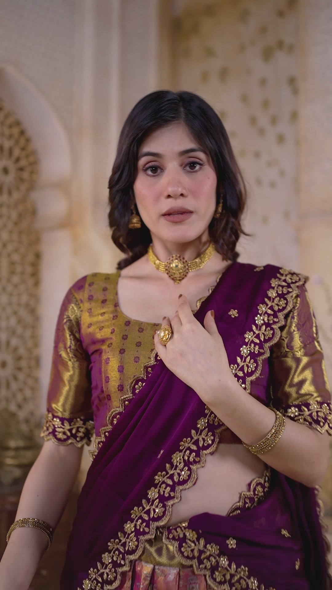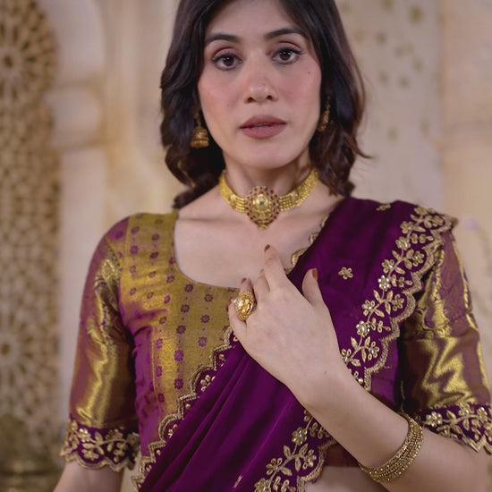Border: Heavy golden zari with purple lace border